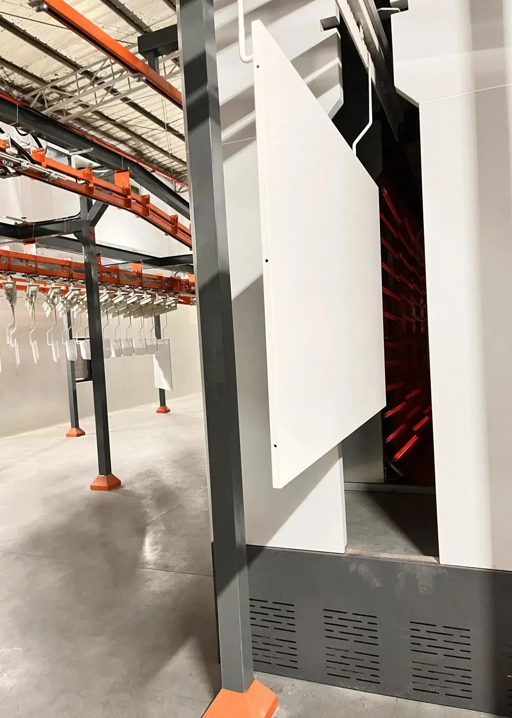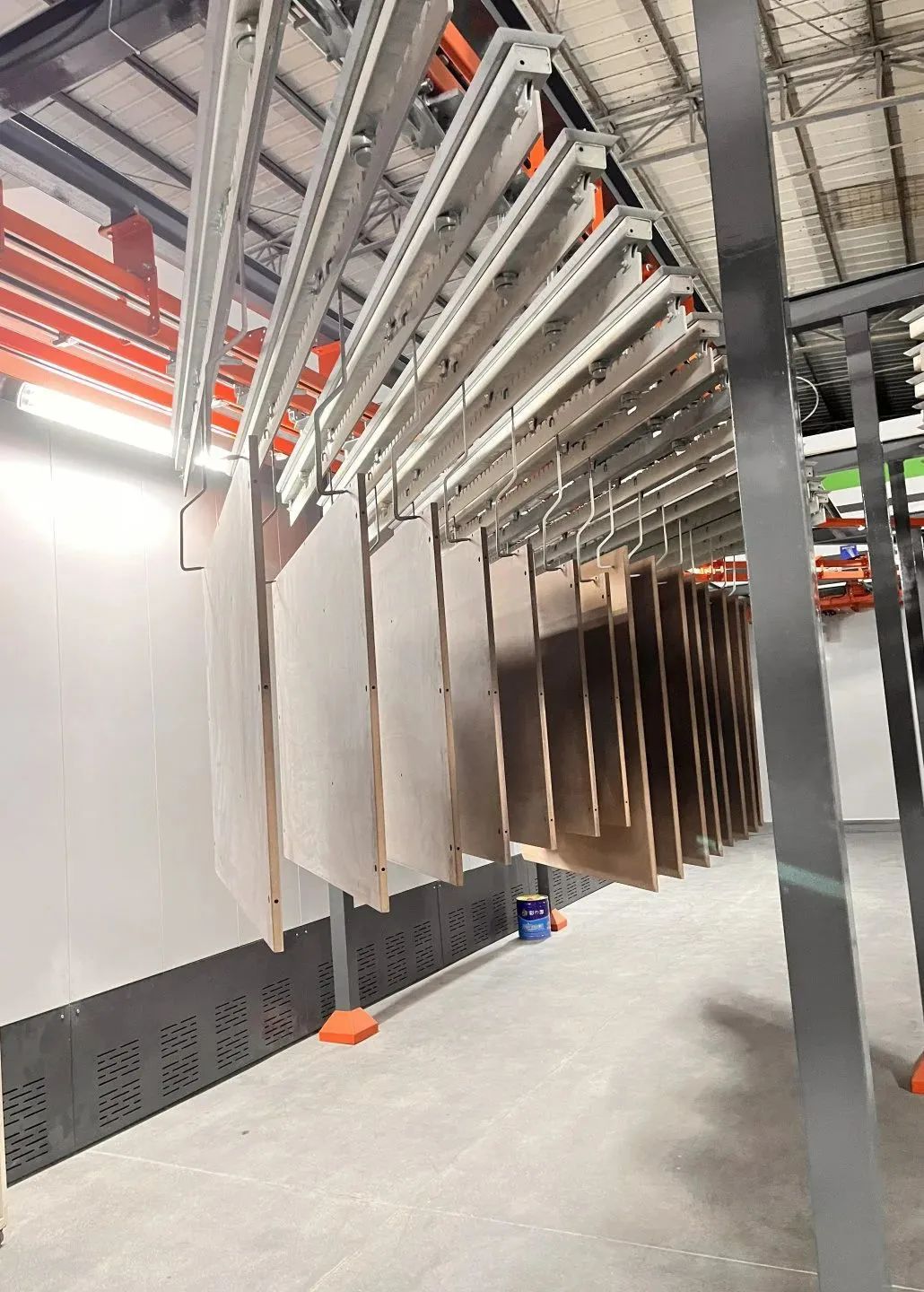 這條全新的MDF粉末噴涂生產(chǎn)線采用了數(shù)字固化系統(tǒng),可調(diào)式積放鏈系統(tǒng),雙粉房固化系統(tǒng),一體化集成系統(tǒng),魔術(shù)快速換色系統(tǒng),以及智能化冷卻系統(tǒng)。具有高效率、高精度、高穩(wěn)定性的特點(diǎn)??赏瑫r(shí)噴至少兩種顏色,同步噴粉和同步固化,更柔性、效率更高,產(chǎn)能可實(shí)現(xiàn)1500平方/天。