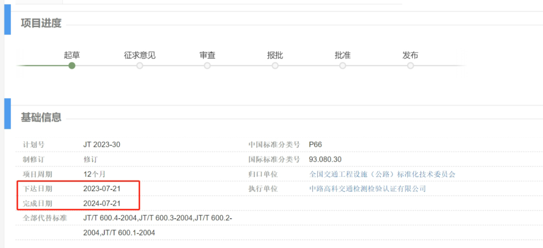 另外,該行標(biāo)為修訂,項(xiàng)目周期為12個(gè)月,下達(dá)日期為2023年7月21日,計(jì)劃完成日期為2024年7月21日。實(shí)施后將替代標(biāo)準(zhǔn)JT/T 600.4-2004,JT/T 600.3-2004,JT/T 600.2-2004,JT/T 600.1-2004。