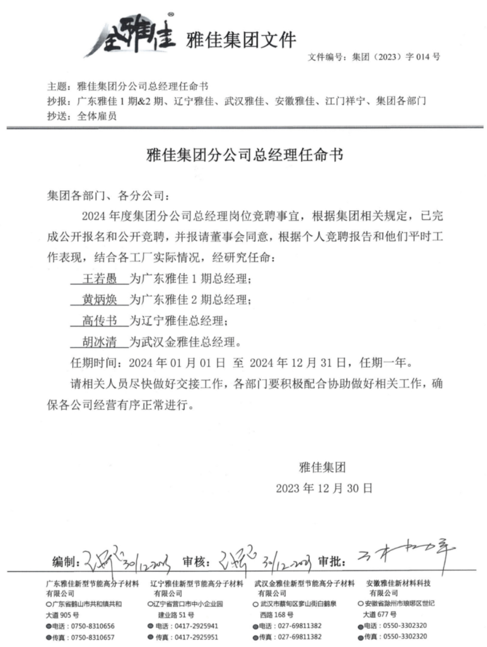 2023年12月29日,雅佳集團(tuán)2024年度總經(jīng)理崗位競(jìng)聘大會(huì)在集團(tuán)各工廠線上線下同步舉行,集團(tuán)董事長(zhǎng)王桂祥和各工廠在職正式股東,以及各廠部職工出席會(huì)議。舉行總經(jīng)理崗位競(jìng)聘大會(huì),是“為雅佳選將才,為人才搭平臺(tái)”。雅佳希望通過(guò)競(jìng)聘會(huì),讓優(yōu)秀者脫穎而出,讓所有人長(zhǎng)知識(shí)、開眼界,讓公司踏上新征程。