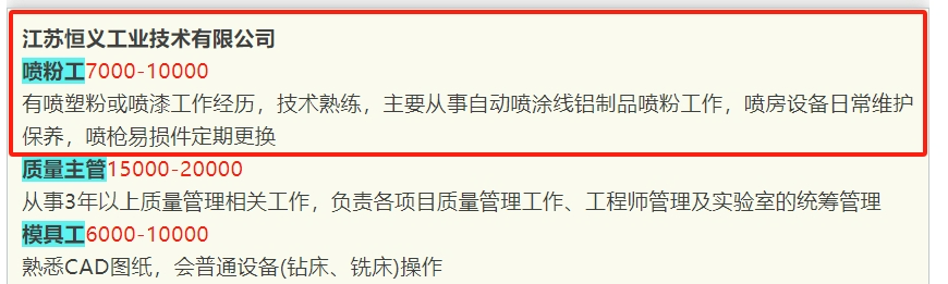 此前,江蘇恒義就曾就招聘噴粉工開出7000-10000元/月的工資價格。要求有噴塑粉或噴漆工作經(jīng)歷,技術(shù)熟練。日常工作內(nèi)容就是主要從事自動噴涂線鋁制品噴粉工作,噴房設(shè)備日常維護(hù)保養(yǎng),噴槍易損件定期更換。