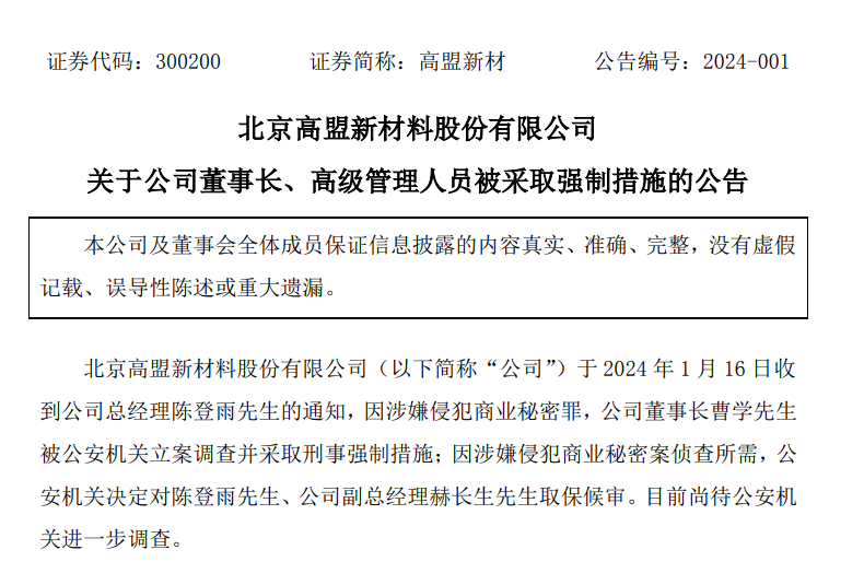 2024年1月17日,北京高盟新材料股份有限公司(下稱“高盟新材”)對外發(fā)布《關(guān)于公司董事長、高級管理人員被采取強制措施的公告》。