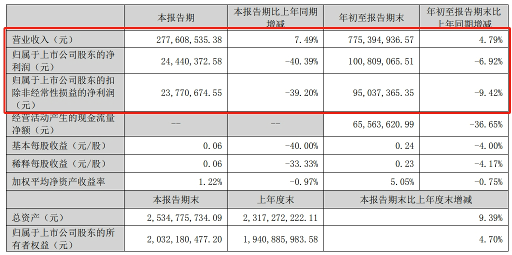財報顯示,高盟新材2023年前三季度實現(xiàn)營業(yè)收入7.75億元,同比增長4.79%;實現(xiàn)凈利潤1億元,同比下滑6.92%;實現(xiàn)扣非后凈利潤9503.74萬元,同比下滑9.42%。