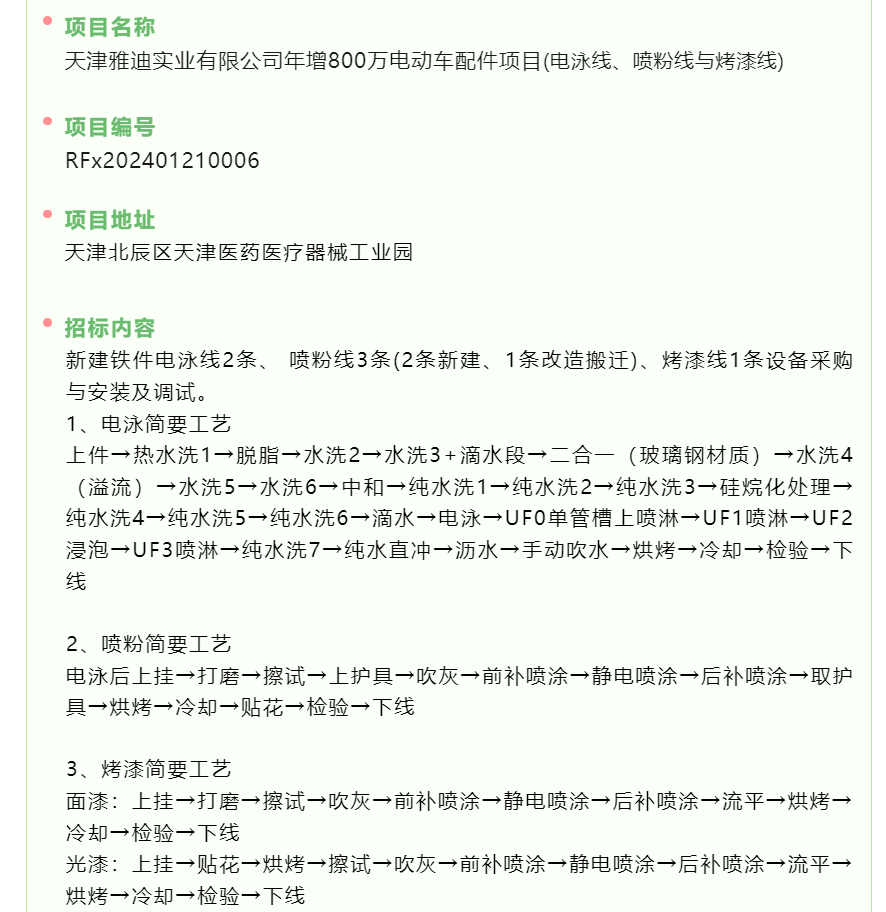 公告中指出,天津雅迪擬新建鐵件電泳線2條、 噴粉線3條(2條新建、1條改造搬遷)、烤漆線1條設(shè)備采購與安裝及調(diào)試。歡迎符合公告要求的意向單位參加報(bào)名預(yù)審,如通過報(bào)名預(yù)審將被邀請參與后續(xù)的招投標(biāo)事宜。參與報(bào)名時間為2024年1月22日——2024年1月28日24:00止。