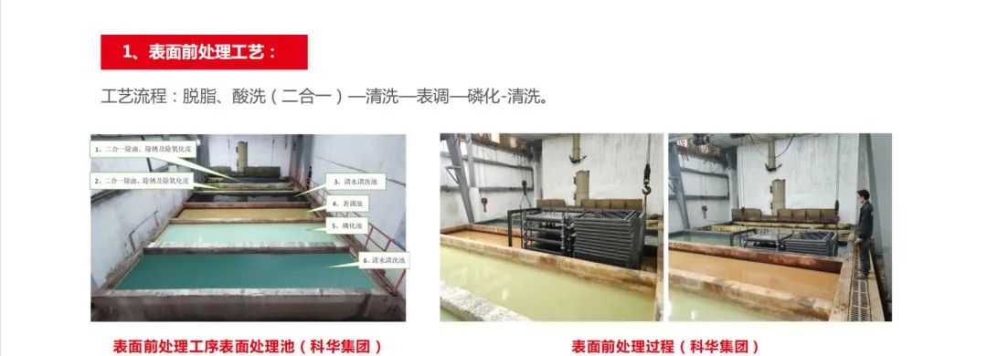 據(jù)科華集團介紹,新型電泳噴粉復合工藝結(jié)合了酸洗、磷化前處理、表面電泳處理和靜電噴粉的優(yōu)勢,采用“表面前處理+電泳噴粉復合工藝處理“的工藝流程。