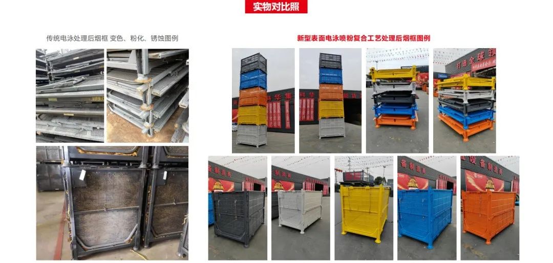 目前,各煙草公司在煙框使用過程中,普遍反映傳統(tǒng)的表面電泳處理存在電泳層變色、表面粉化、銹蝕等問題,針對此類問題,科華集團經(jīng)過多種表面處理方式的論證、試驗,開發(fā)出一套新型表面電泳噴粉復合工藝方法,有效地解決了電泳層易變色、粉化、銹蝕的現(xiàn)象,抗腐蝕性能明顯增強,現(xiàn)科華集團在醫(yī)藥行業(yè)鋼制托盤、汽車行業(yè)、煙草行業(yè)(云南煙草煙葉公司)已開始廣泛運用。