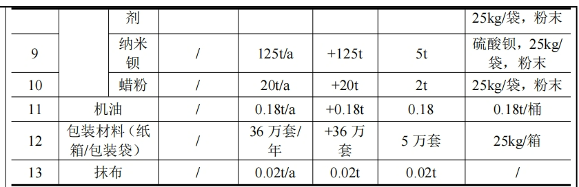 根據(jù)披露,本項目主要原輔材料表聚酯樹脂3900t/a、環(huán)氧樹脂800t/a、鈦白粉1200t/a、顏料190t/a、碳酸鈣填料910t/a、硫酸鋇填料1650t/a、固化劑(TGIC)230t/a、流平劑助劑220t/a、納米鋇助劑125t/a、蠟粉助劑20t/a等。