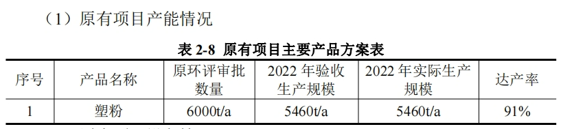 企業(yè)原有項目位于海寧市鹽官鎮(zhèn)建設(shè)東路11號,租賃的海寧景上照明科技有限公司廠,主要從事塑粉新材料的研發(fā)、制造、加工。目前企業(yè)仍在正常生產(chǎn)中,待新項目建設(shè)完成后原有項目將停產(chǎn)實施整體搬遷,廠房將由原房東收回。原有項目2022年實際生產(chǎn)規(guī)模5460噸/年,達產(chǎn)率91%。