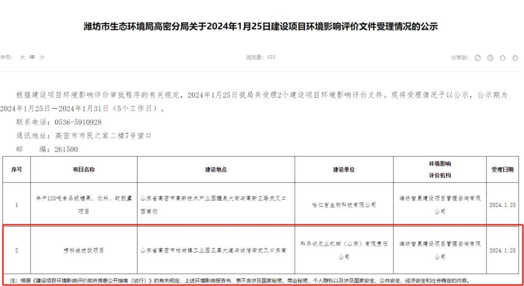 根據(jù)濰坊市生態(tài)環(huán)境局高密分局近日發(fā)布的《關(guān)于2024年1月25日建設項目環(huán)境影響評價文件受理情況的公示》顯示,科樂收農(nóng)業(yè)機械(山東)有限責任公司,噴粉線技改項目已進入環(huán)評階段。
