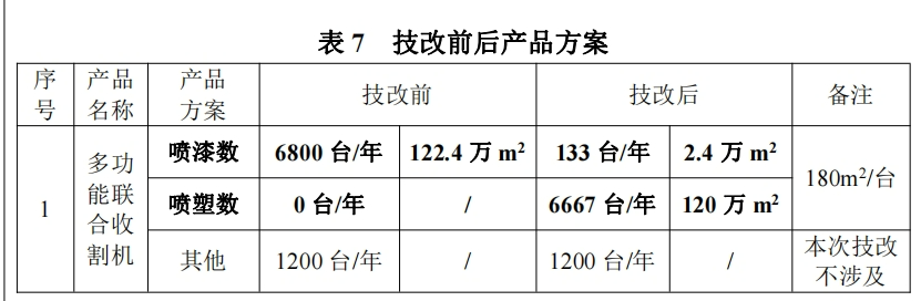 根據(jù)披露,為進一步降低企業(yè)成本,推進污染物減排成效,依據(jù)《低揮發(fā)性原輔材料替代企業(yè)豁免揮發(fā)性有機物末端治理實施細則(試行)》企業(yè)開展低揮發(fā)性原輔材料替代工作。公司擬投資1880萬元,針對“年產(chǎn)八千臺多功能聯(lián)合收割機技改擴建項目”進行技術(shù)改造,將98%的噴漆產(chǎn)能改為噴塑。新購置安裝自動噴粉房、烘干室、打磨室等設備,形成“科樂收農(nóng)業(yè)機械(山東)有限責任公司噴粉線技改項目”。