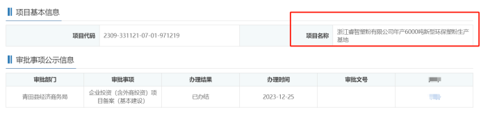 趣涂料(趣涂網(wǎng))了解到,2023年12月25日,浙江睿智塑粉有限公司,年產(chǎn)6000噸新型環(huán)保塑粉生產(chǎn)基地,在青田縣經(jīng)濟(jì)商務(wù)局,進(jìn)行企業(yè)投資(含外商投資)項(xiàng)目備案。