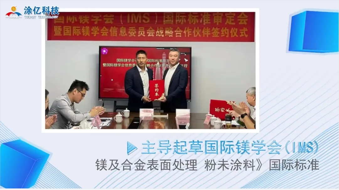 在積極推動國內粉末涂料標準化的同時,涂億科技還積極參與國際標準的制定。在國際鎂學會(IMS)的平臺上,涂億科技主導起草了《鎂及合金表面處理 粉末涂料》國際標準。這一標準的制定,旨在為全球鎂及合金表面處理領域提供統(tǒng)一的技術規(guī)范和質量要求,推動行業(yè)的技術進步和國際合作。通過參與國際標準的制定,涂億科技不僅展示了其在粉末涂料領域的領先地位,也為提升中國企業(yè)在全球舞臺上的影響力和話語權貢獻了自己的力量。
