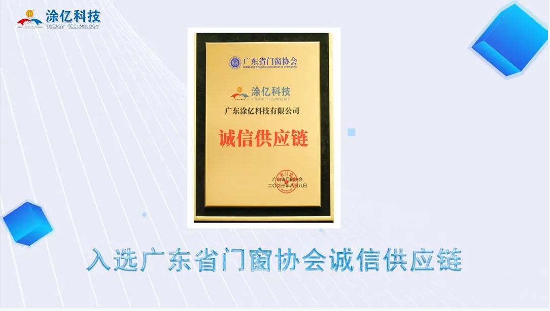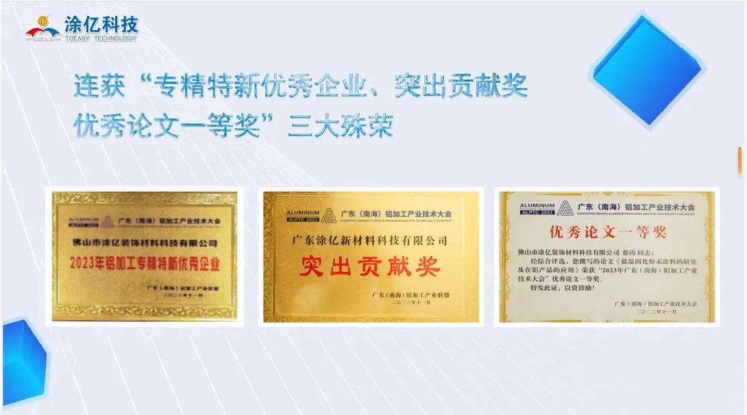 2023年,涂億科技以其卓越的表現(xiàn)和持續(xù)的努力,贏得了眾多榮譽和獎項,充分展現(xiàn)了其在粉末涂料行業(yè)的領先地位和強大的企業(yè)實力。公司入選廣東省門窗協(xié)會誠信供應鏈、榮獲中國家具門窗行業(yè)“精創(chuàng)獎”、連獲“專精特新優(yōu)秀企業(yè)、突出貢獻獎、優(yōu)秀論文一等獎”三大殊榮、獲得中國綠色產品認證,產品符合IATF16949:2016質量管理體系標準認證,榮獲第五屆“佛山高新技術進步獎”二等獎和獲得中國有色金屬工業(yè)科學技術二等獎等等。