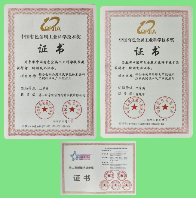 2022年8月涂億科技主導《鋁合金制品用綠色節(jié)能粉末涂料關鍵技術及產業(yè)化應用》項目由中華人民共和國科學技術部中國有色金屬學會評為:該項目整體技術達到國際先進水平、其中低溫固化與超細粉末一體化技術達到國際領先水平。繼該項目榮獲2023年度中國有色金屬工業(yè)科學技術獎二等獎后,又榮獲第五屆“佛山高新技術進步獎”二等獎。