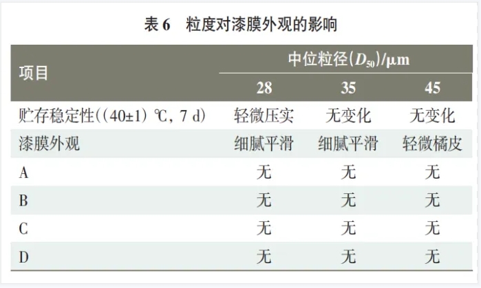 5)粒度選用中位粒徑為35μm,得到的漆膜細(xì)膩,貯存穩(wěn)定性好。