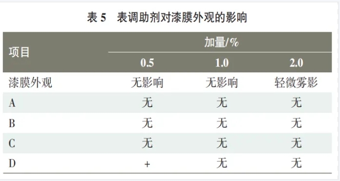 由表5可以看出:加入0.5%表調(diào)助劑,漆膜表面光亮平整光滑,但在工件有處理液污染下還是不能完全解決縮孔問題。加入1.0%和2.0%表調(diào)助劑,都很好地解決了污染工件表面縮孔問題。