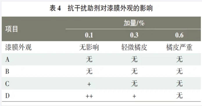 由表4可以看出:加入0.1%抗干擾助劑,漆膜表面光亮平整光滑,但在工件有油漬和處理液污染下還是不能很好地改善縮孔問題。加入0.3%抗干擾劑,漆膜表面有輕微橘皮,對殘留水分、油漬的工件表面有明顯改善效果,但是對于有保護(hù)液殘留工件的縮孔改善效果不明顯。加入0.6%抗干擾劑,在工件表面少量油漬、水分殘留、處理液情況下對縮孔改善效果明顯,但是表面橘皮嚴(yán)重。