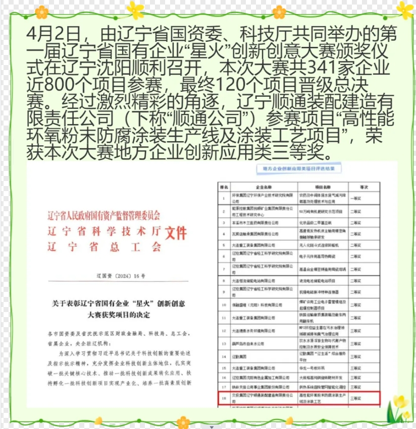 同時(shí),順通公司高性能環(huán)氧粉末防腐涂裝生產(chǎn)線及涂裝工藝項(xiàng)目的獲獎(jiǎng)與企業(yè)多年來堅(jiān)持創(chuàng)新的理念分不開。