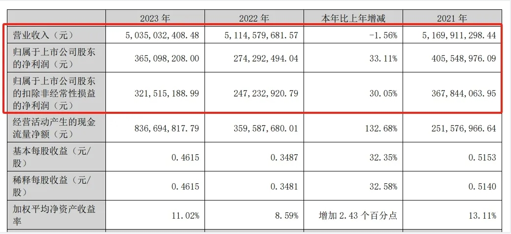 2023年,康力電梯實(shí)現(xiàn)營(yíng)業(yè)收入達(dá)50.35億元,較上年同期下降1.56%;實(shí)現(xiàn)利潤(rùn)總額4.09億元,實(shí)現(xiàn)歸屬于上市公司股東的凈利潤(rùn)3.65億元,與上年同期相比增長(zhǎng)了33.11%(公司實(shí)施第二次員工持股計(jì)劃和股票期權(quán)激勵(lì)計(jì)劃的攤銷成本,影響2023年度稅前利潤(rùn)總額339.93萬(wàn)元);經(jīng)營(yíng)活動(dòng)凈現(xiàn)金流量8.3億元。公司經(jīng)營(yíng)質(zhì)量保持在較高水平。
