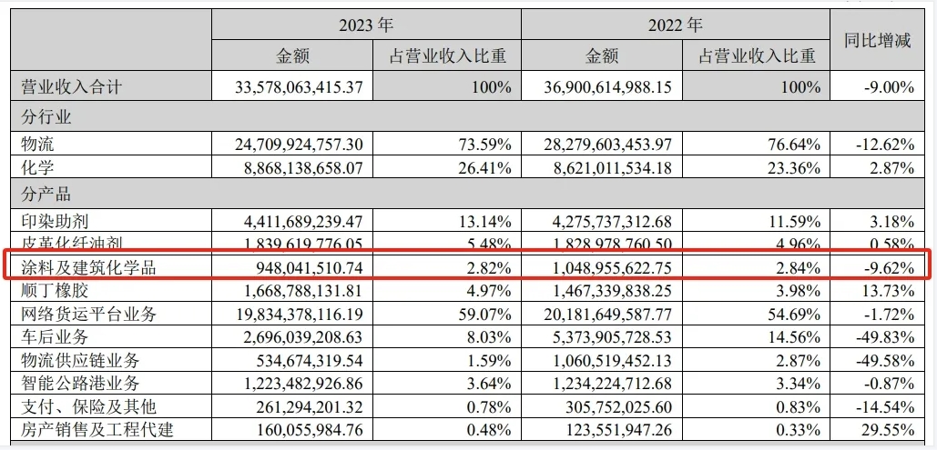 2024年4月23日,傳化智聯(lián)股份有限公司(下稱“傳化智聯(lián)”)對(duì)外發(fā)布《2023年年度報(bào)告》。報(bào)告顯示,2023年傳化智聯(lián)實(shí)現(xiàn)營(yíng)業(yè)收入335.78億元,同比下滑9%;實(shí)現(xiàn)凈利潤(rùn)5.91億元,同比下滑20.70%;實(shí)現(xiàn)扣非后凈利潤(rùn)2.88億元,同比下滑38.43%。其中,涂料及建筑化學(xué)品業(yè)務(wù)實(shí)現(xiàn)營(yíng)業(yè)收入9.48億元,同比增長(zhǎng)2.82%。