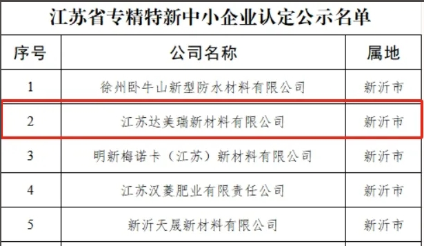 2023年12月,江蘇省工信廳公示了江蘇省2023年“專精特新”中小企業(yè)獲批名單,江蘇達(dá)美瑞新材料有限公司獲批省級(jí)“專精特新”企業(yè)。