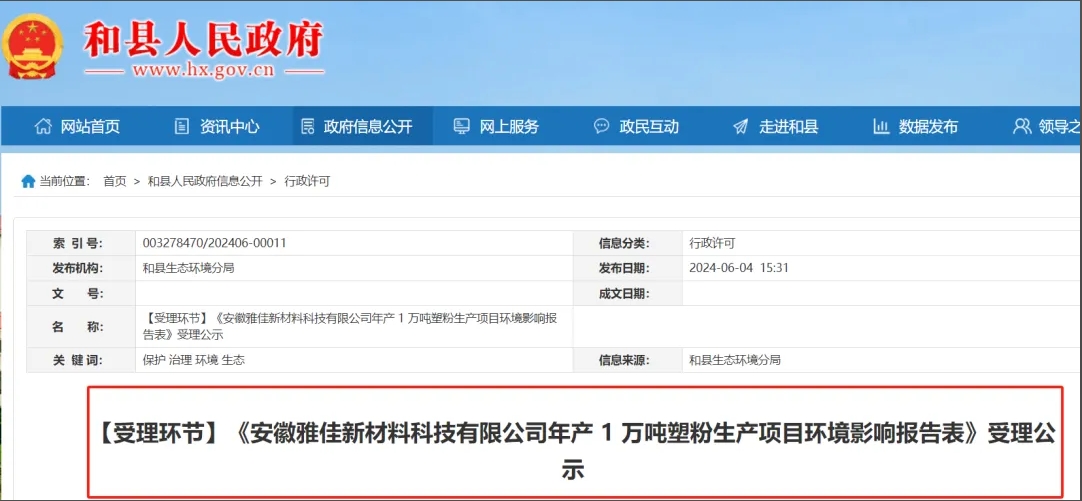 近日,安徽馬鞍山市和縣生態(tài)環(huán)境分局對外發(fā)布《安徽雅佳新材料科技有限公司年產(chǎn)1萬噸塑粉生產(chǎn)項目環(huán)境影響報告表》受理公示。