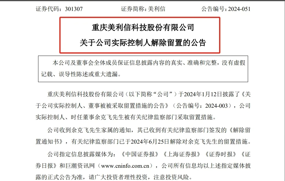2024年6月6日,重慶美利信科技股份有限公司(以下簡稱“美利信”)對外發(fā)布《關(guān)于公司實際控制人解除留置的公告》。