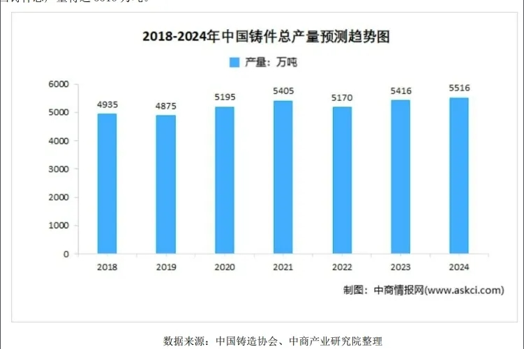 經(jīng)過70余年的發(fā)展,我國壓鑄行業(yè)在企業(yè)素質(zhì)、管理水平、工藝技術(shù)、產(chǎn)品質(zhì)量等諸多方面均有長足的進步,已成為世界上壓鑄件的生產(chǎn)和消費大國之一。當(dāng)前及今后一段時期,我國汽車、通信等行業(yè)仍將保持快速發(fā)展,尤其是新能源汽車、5G通信技術(shù)、儲能等行業(yè)的迅猛發(fā)展,加之其他工業(yè)領(lǐng)域的壓鑄件用量快速增長,為我國的壓鑄行業(yè)帶來廣闊的市場空間。根據(jù)中國鑄造協(xié)會、中商產(chǎn)業(yè)研究院分析師預(yù)測,2024年我國鑄件總產(chǎn)量將達5516萬噸。