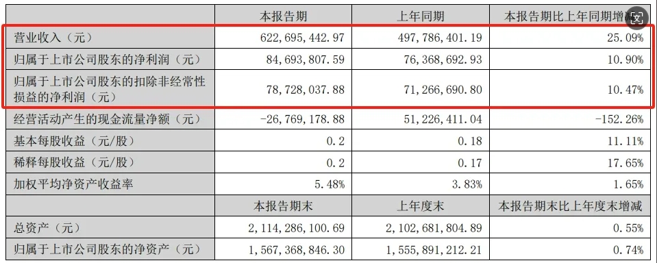 半年報(bào)中指出,高盟新材今年上半年實(shí)現(xiàn)營業(yè)收入6.23億元,同比增加1.25億元,增幅為25.09%;實(shí)現(xiàn)凈利潤8469.38萬元,同比增加832.51萬元,增幅為10.90%;實(shí)現(xiàn)扣非后凈利潤7872.8萬元,同比增長10.47%。