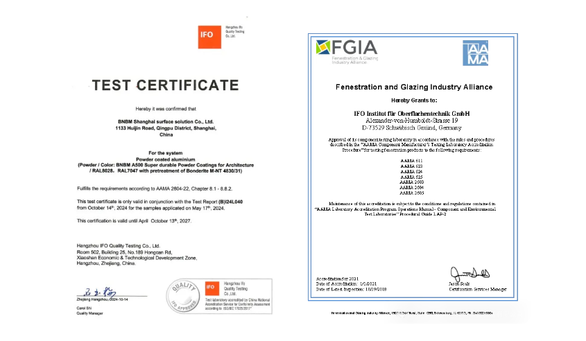 AAMA全稱(chēng)美國(guó)建筑制造商協(xié)會(huì),成立于1962年,1972年通過(guò)美國(guó)國(guó)家標(biāo)準(zhǔn)學(xué)會(huì)認(rèn)可,主要應(yīng)用于門(mén)窗幕墻行業(yè),在美國(guó)市場(chǎng)、亞洲和中東比較活躍,全球范圍內(nèi)大約有400多個(gè)會(huì)員單位。該測(cè)試作為門(mén)窗幕墻行業(yè)最為核心的測(cè)試標(biāo)準(zhǔn)之一,對(duì)建材產(chǎn)品的耐候性、耐腐蝕性、顏色持久性等關(guān)鍵性能指標(biāo)有著極高的要求。此次龍牌A500能夠順利通過(guò)AAMA 2604-22標(biāo)準(zhǔn)的測(cè)試,是對(duì)北新粉末技術(shù)實(shí)力和產(chǎn)品質(zhì)量的有力證明。