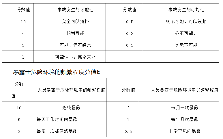 3、工作條件危險性評價法:對作業(yè)頻率較高,潛在危險危害性較大的操作以及安裝、維修等作業(yè)采用作業(yè)條件危險性評價法,影響作業(yè)條件危險性的因素是L(事故發(fā)生的可能性)、E(人員暴露于危險環(huán)境的頻繁程度)和C(一旦發(fā)生事故可能造成的后果)。L、E、C的分值分別見工作條件危險性評價法評價準則定義。用這三個因素分值的乘積D=L×E×C來評價作業(yè)條件的危險性(見工作條件危險性評價法評價準則定義)。D值越大,作業(yè)條件的危險性越大。