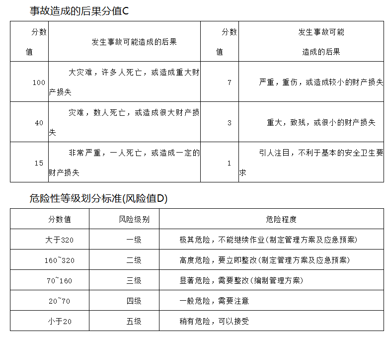 2、工作條件危險性評價法評價準則: