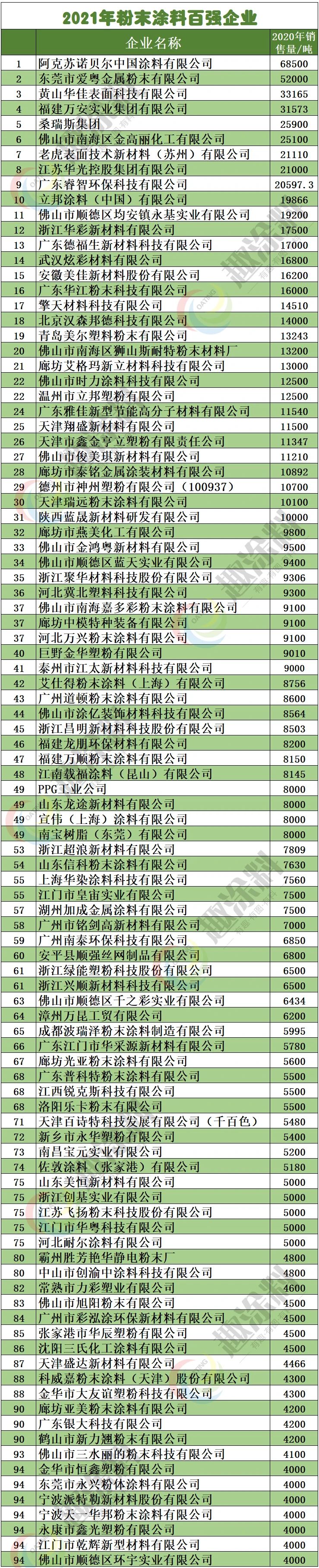 此外,行業(yè)統(tǒng)計數(shù)據(jù)顯示,今年入選2021年粉末涂料百強企業(yè)中,全年銷量超過10000噸的企業(yè)數(shù)量為31個;百強榜單的入選門檻是年銷售量4000噸。